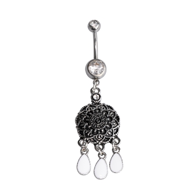 Bei diesem Bauchnabelpiercing bestehen der Stab und die abschraubbare 5 mm Kugel aus hochwertigem Chirurgenstahl 316L. Der Anhänger ist aus versilbertem Messing. Bauchnabelpiercing ist mit einer 1,6 mm Stabstärke und einer 10 mm Stablänge erhältlich.