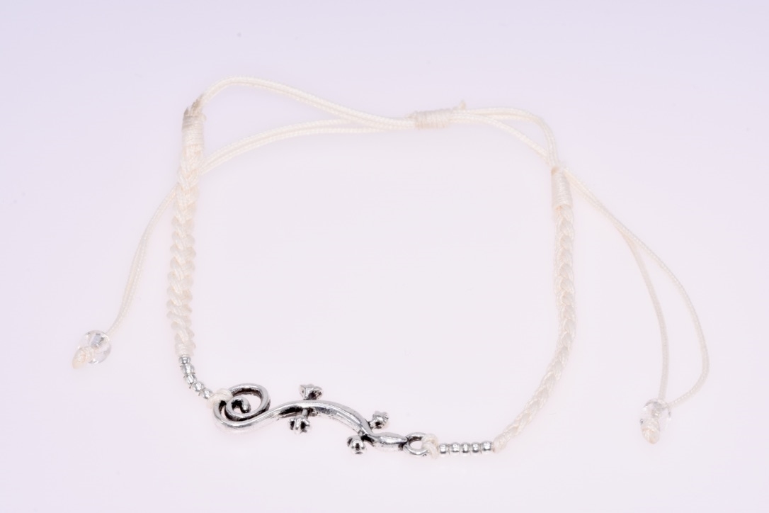 Beiges Armband mit einem Salamander Motiv in der Mitte! Dieses Armband ist mit einem Pull-Tie-Verschluss verstellbar und passt an jedes Handgelenk. Ein Pull-Tie-Verschluss bedeutet einfach, dass Sie ihn einfach abziehen und wieder ziehen können, indem Sie die Schnüre ziehen! Die Länge des Salamanders beträgt 25 mm.