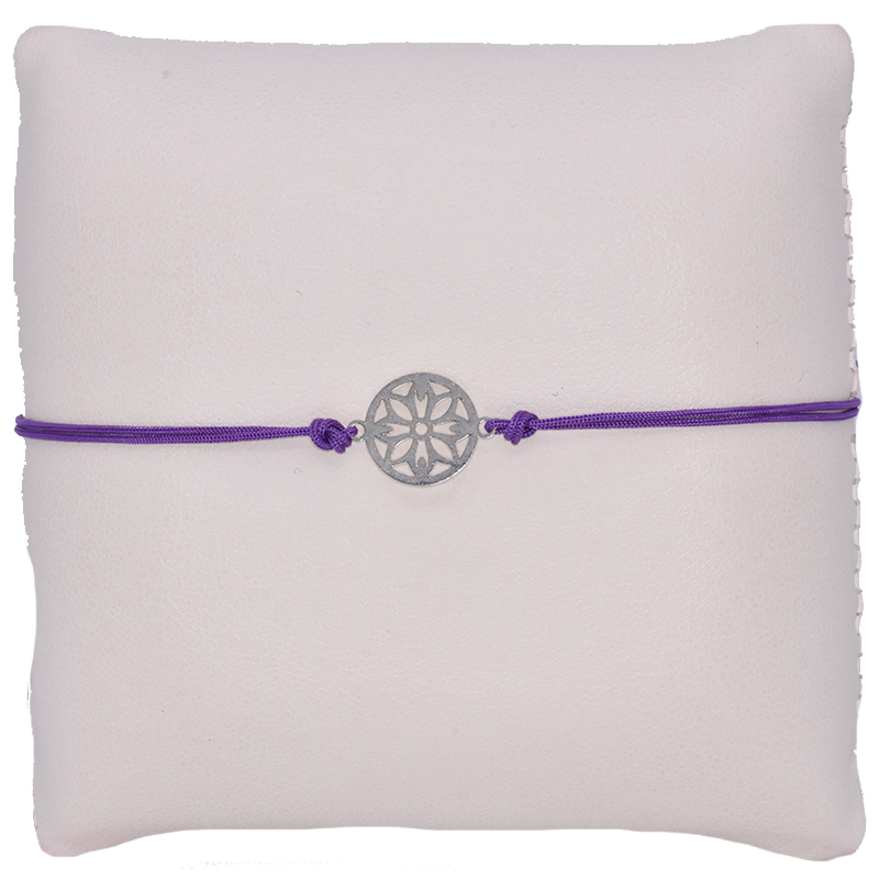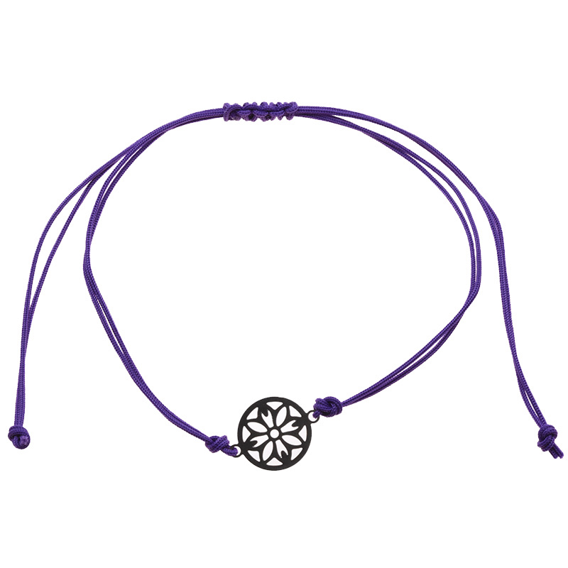 Lila Kordelarmband mit Blumenmotiv in der Mitte! Dieses Armband ist mit einem Pull-Tie-Verschluss verstellbar und passt an jedes Handgelenk. Ein Pull-Tie-Verschluss bedeutet einfach, dass Sie ihn einfach abziehen und wieder ziehen können, indem Sie die Schnüre ziehen! Der Durchmesser des Motivs beträgt 10 mm.