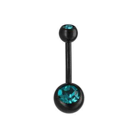 The curved bar and the detachable ball are made of high quality surgical steel 316L and have a black PVD coating. The bottom ball is soldered firmly to the banana. There is a sparkling crystal in both balls. The material used is characterized by its special properties such as color fastness and material resistance. This belly ring has a bar thickness of 1.6 mm and a bar length of 10 mm.