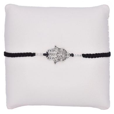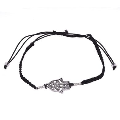 Black-colored bracelet with a Hamsa motif in the middle! This bracelet is adjustable with a pull-tie closure and fits every wrist. Pull-tie closure simply means that you can easily take it off and on by pulling the cords! The length of the Hamsa hand is 20 mm.