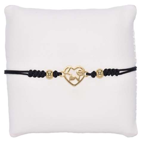 Black cord bracelet with a steel gold colored heart motif. This bracelet is adjustable with a pull-tie closure and fits every wrist. Pull-tie closure simply means that you can easily take it off and on by pulling the cords! The diameter of the heart is 14 mm.
