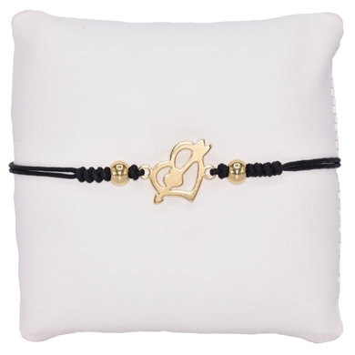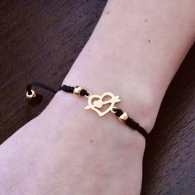 Black cord bracelet with a steel gold colored heart motif. This bracelet is adjustable with a pull-tie closure and fits every wrist. Pull-tie closure simply means that you can easily take it off and on by pulling the cords! The diameter of the heart is 15 mm.