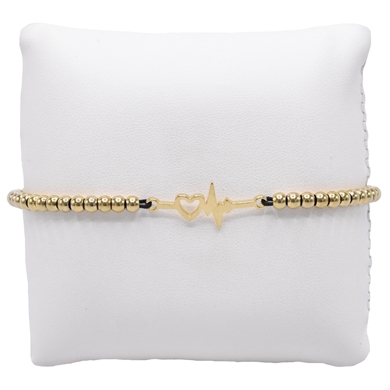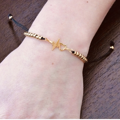 Black cord bracelet with steel golden balls and a heart / heartbeat motif. This bracelet is adjustable with a pull-tie closure and fits every wrist. Pull-tie closure simply means that you can easily take it off and on by pulling the cords! The length of the design is 24 mm.