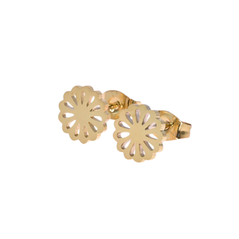 Stylish steel stud earrings covered with a gold colored PVD coating.