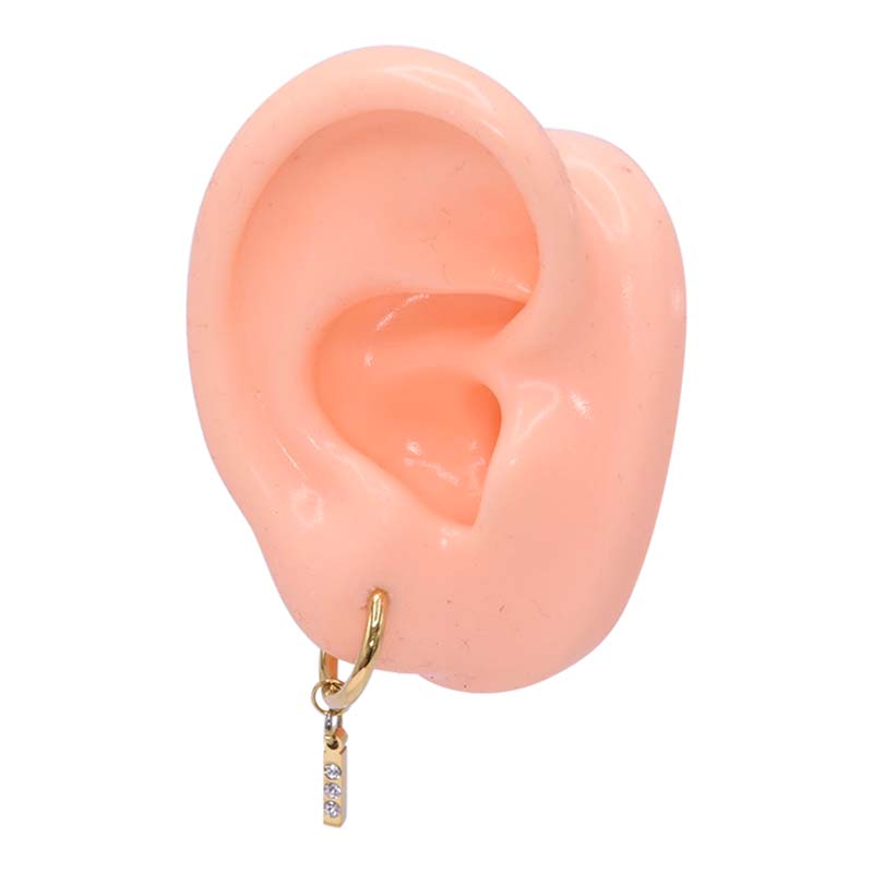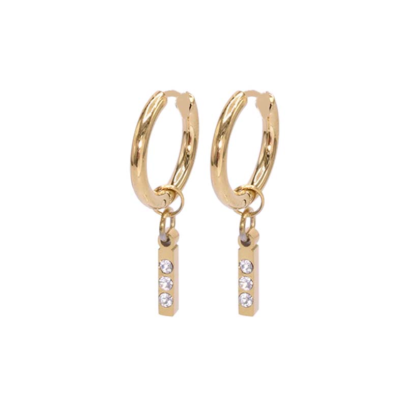 Give your outfit a boost with these earrings! These earrings have a rectangular pendant and are covered with 3 white crystals. Combine these beautiful earrings with other earrings/piercings. These gold colored earrings are made of stainless steel and are nickel free, so the chance of discoloration is virtually nil! You will enjoy your stainless steel earrings for a long time. The earrings have a diameter of 10 mm (measured from the inside) and a thickness of 2 mm. The length of the pendant is 10 mm.