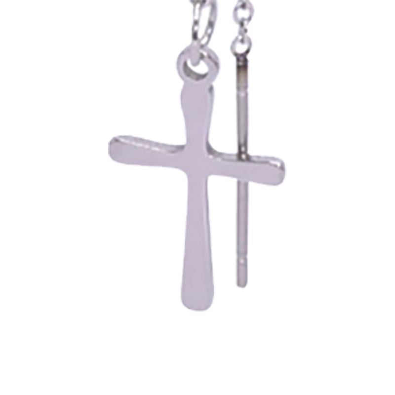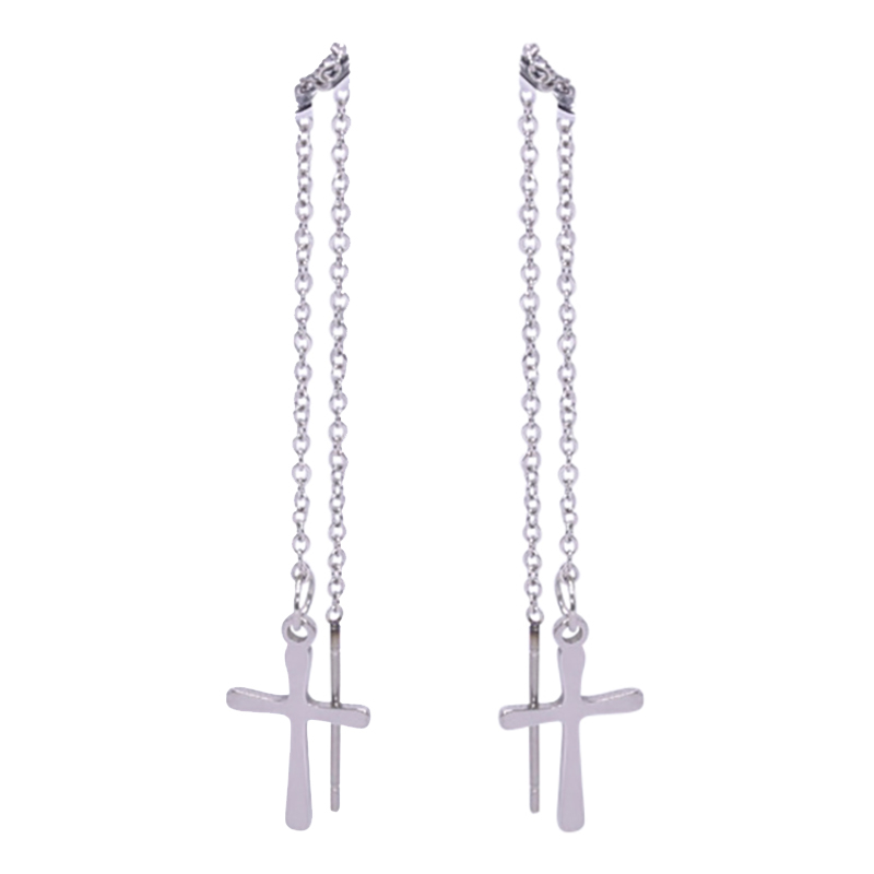 Earrings in steel with a chain, silver colored with a cross