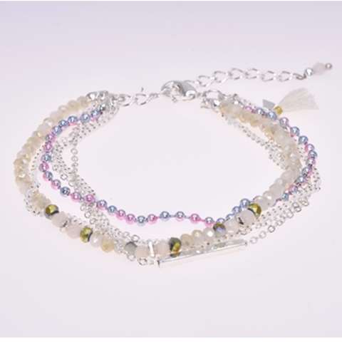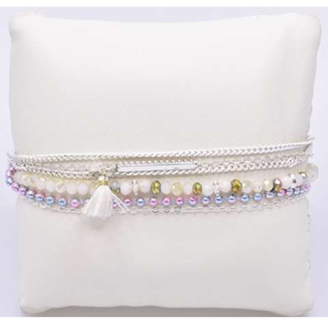 Set of 5 bracelets connected with 1 single lock. This playful bracelet gives a fresh twist to all your looks and can be worn both through the winter and during the summer. Adjustable in size.