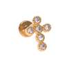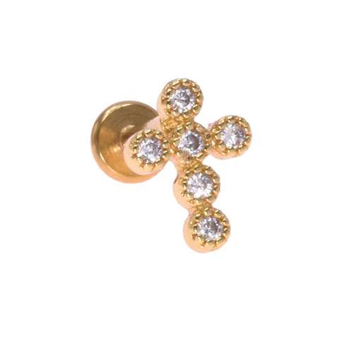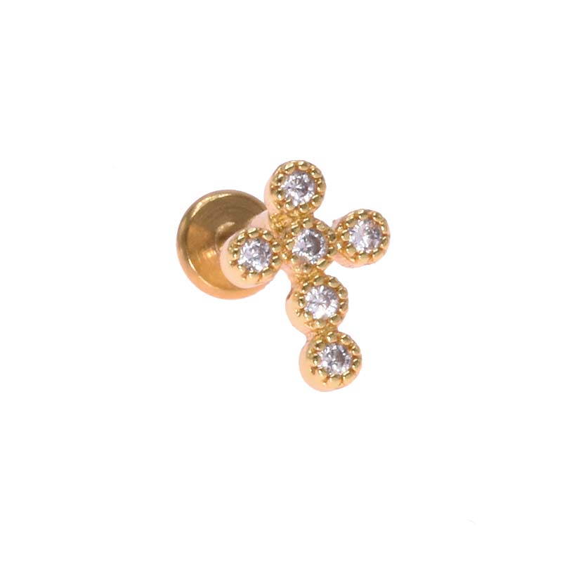 Helix/tragus/labret piercing in gold surgical steel with a cross and different white crystals