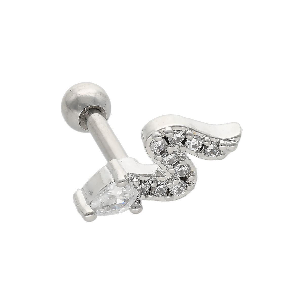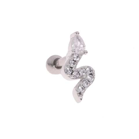 Helix/tragus piercing in surgical steel with a snake covered in white crystals