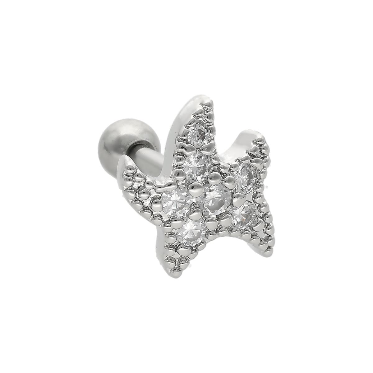 Helix/tragus piercing in surgical steel with a starfish and covered with white crystals