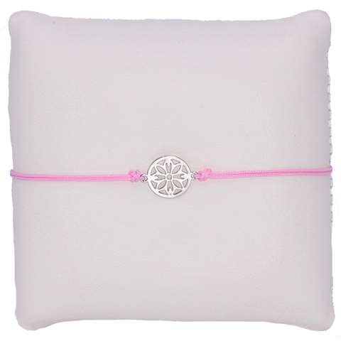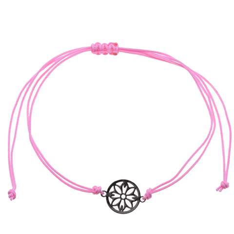 Pink cord bracelet with a flower motif in the middle! This bracelet is adjustable with a pull-tie closure and fits every wrist. Pull-tie closure simply means that you can easily take it off and on by pulling the cords! The diameter of the motif is 10 mm.