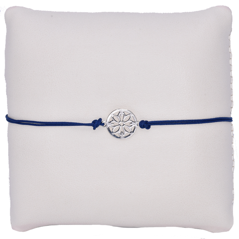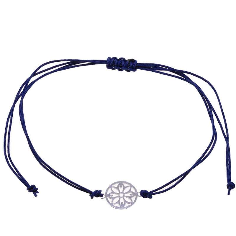Bracelet cordon de couleur bleu foncé avec un motif fleuri au milieu! Ce bracelet est ajustable avec une fermeture à nouer et convient à tous les poignets. La fermeture signifie simplement que vous pouvez facilement l'enlever en tirant sur les cordons! Le diamètre du motif est de 10 mm.