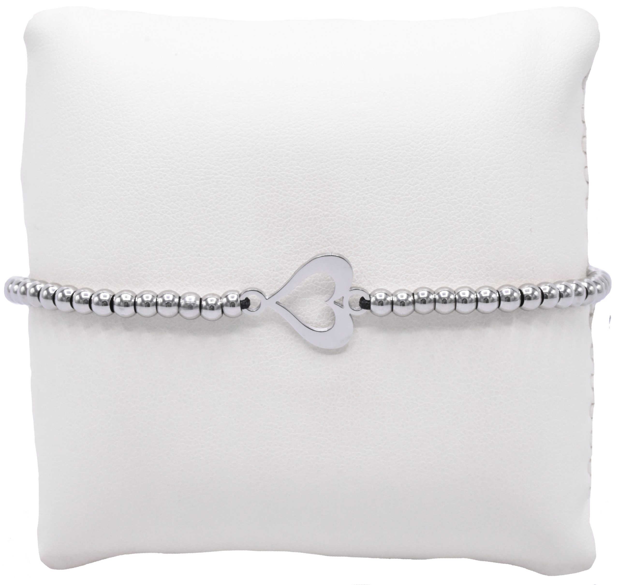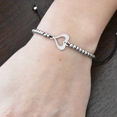 Bracelet cordon noir avec petites billes d'acier et un coeur ouvert