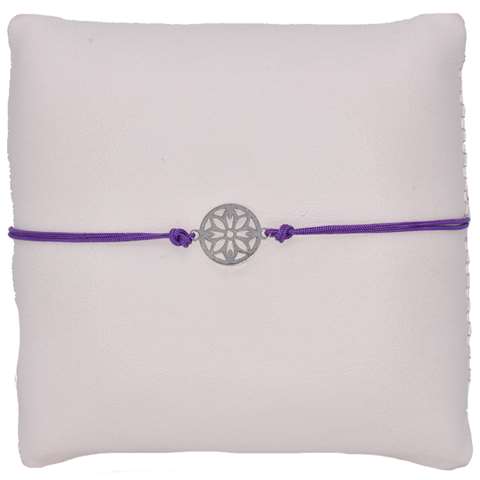Bracelet cordon de couleur violet avec un motif fleuri au milieu! Ce bracelet est ajustable avec une fermeture à nouer et convient à tous les poignets. La fermeture signifie simplement que vous pouvez facilement l'enlever en tirant sur les cordons! Le diamètre du motif est de 10 mm.