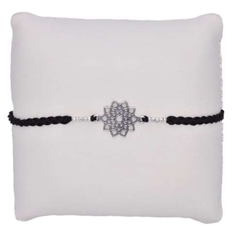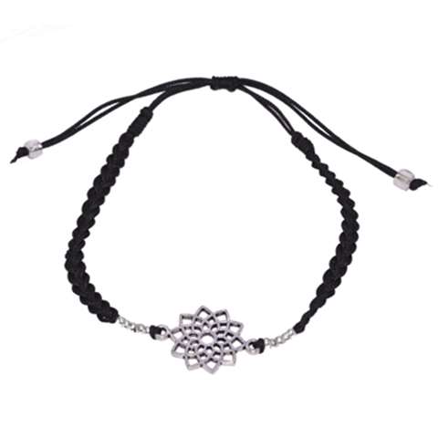 Bracelet de couleur noire avec un motif de fleur au milieu! Ce bracelet est ajustable avec une fermeture à nouer et convient à tous les poignets. La fermeture signifie simplement que vous pouvez facilement l'enlever en tirant sur les cordons! Le diamètre de la fleur est de 14 mm.