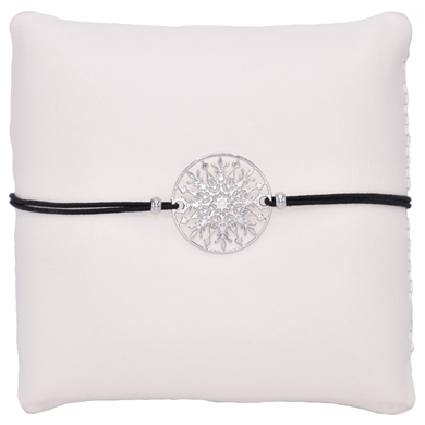 Bracelet ornament magnifique avec une pièce orientale en acier. Le bracelet en textile élastique assure un ajustement confortable et est réglable individuellement en taille. Le diamètre de la pièce est de 2 cm.