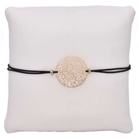 Bracelet ornament magnifique avec une pièce orientale en acier. Le bracelet en textile élastique assure un ajustement confortable et est réglable individuellement en taille. Le diamètre de la pièce est de 2 cm.