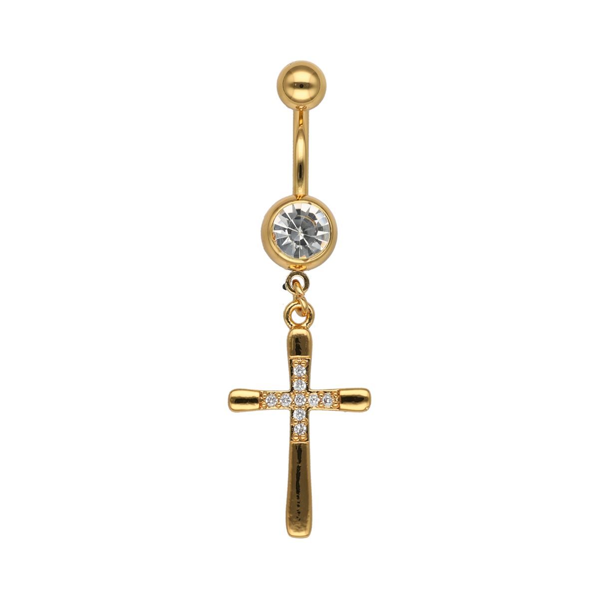 Piercing de nombril en acier doré chirurgical, croix avec des cristaux blancs