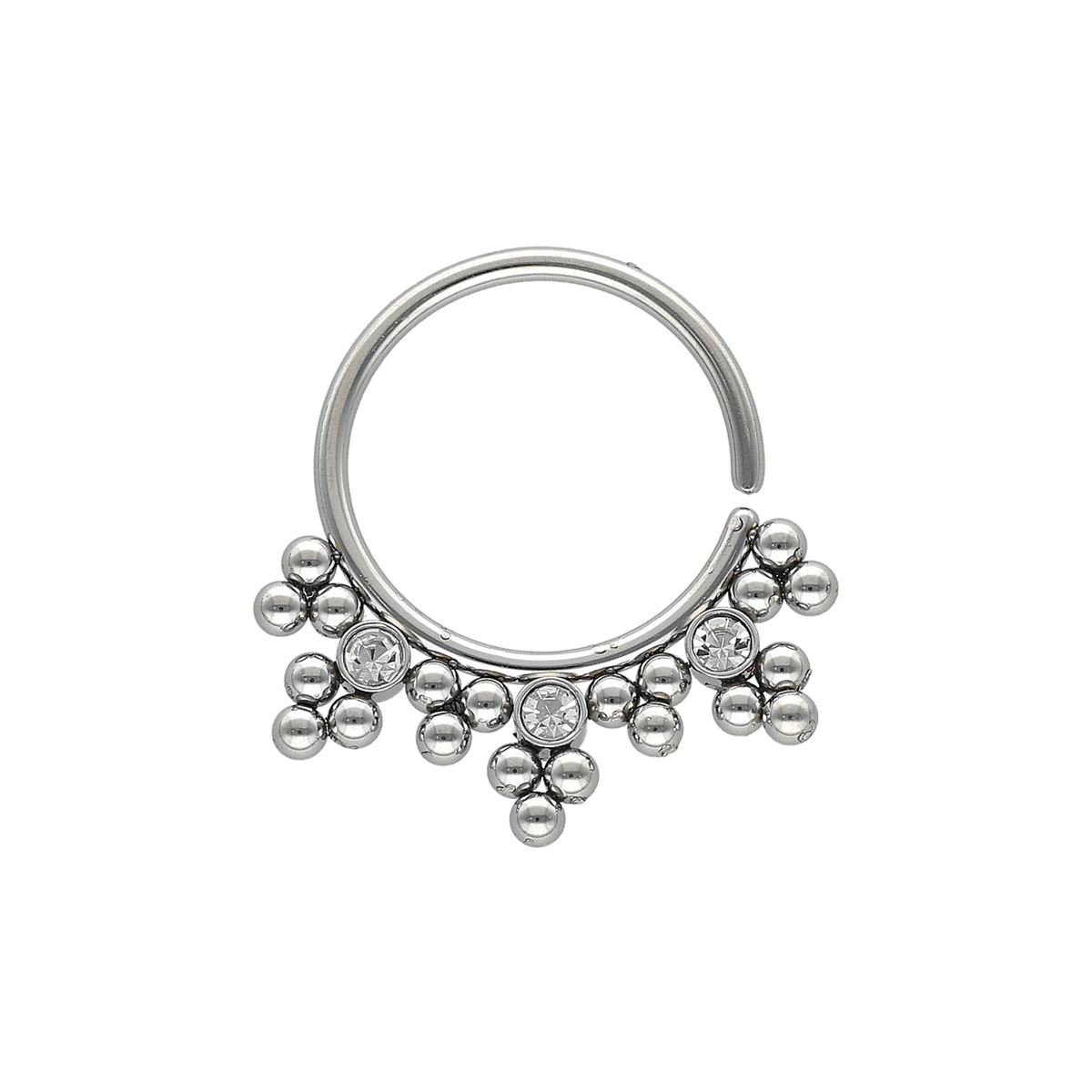 Doorlopende ring in chirurgisch staal, plooibaar met verschillende bolletjes en 3 witte kristallen