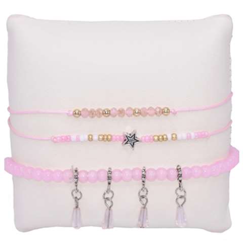 Set van 3 verschillende fantasie armbanden. Kunnen alle 3 tezamen gedragen worden of elk apart. De armbandjes zijn verstelbaar met een pull-tie sluiting of sommige andere met een rekker en past om iedere pols. Pull-tie sluiting betekent simpel gezegd dat je het makkelijk zelf om en af kunt doen door aan de koordjes te trekken!