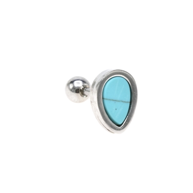 Helix/tragus piercing in chirurgisch staal een een klein turquoise marbel steentje in de vorm van een druppel. Daar de stenen in het marbel zijn, kan het soms gebeuren dat ze van elkander verschillen. Deze oorpiercing heeft een staafdikte van 1,2 mm en een staaflengte van 6 mm. Lengte van het motief bedraagt 9mm, breedte 6mm.