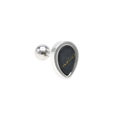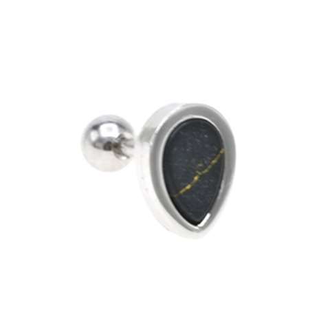 Tragus/helix piercing in chirurgisch staal 316L met een kleine zwarte marbel steentje, in de vorm van een druppel. Daar de stenen in het marbel zijn, kunnen ze steeds van elkaar verschillen. Deze oorpiercing heeft een staafdikte van 1,2 mm en een staaflengte van 6 mm. Lengte van de druppel bedraagt 9mm, breedte 7mm.