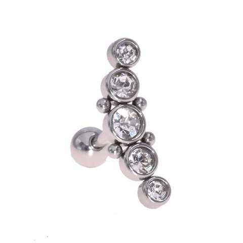 Helix/tragus piercing in chirurgisch staal lange motief met verschillende bolletjes en witte kristallen