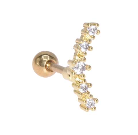 Helix/tragus piercing in goud chirurgisch staal, motief met 5 witte "prong" setting kristallen