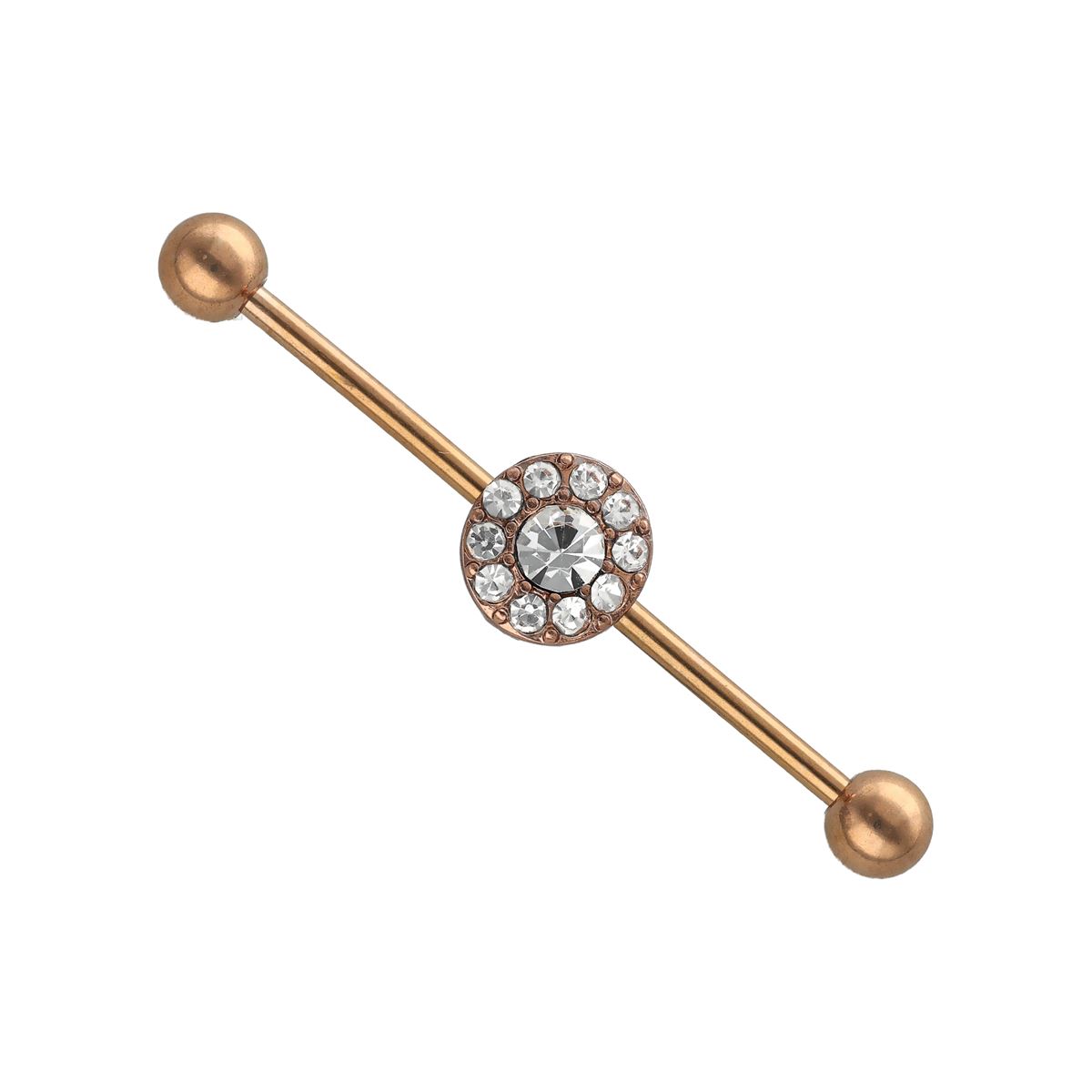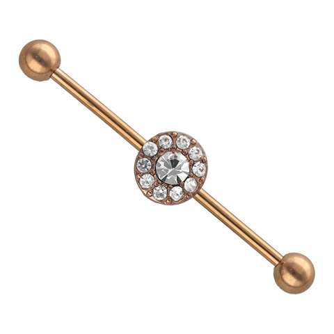 Industrial piercing in rosé goud chirurgisch staal, motief met verschillende witte kristallen