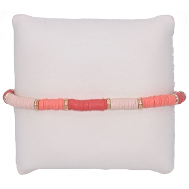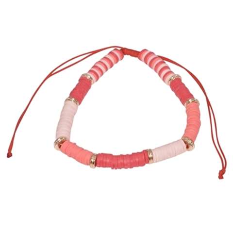 Rood- rooskleurige armband met verschillende polymeer klei steentjes afgewerkt met gouden stalen ringen dewelke aan de armband een elegante en nobele uitstraling geven! Dit armbandje is verstelbaar met een pull-tie sluiting en past om iedere pols. Pull-tie sluiting betekent simpel gezegd dat je het makkelijk zelf om en af kunt doen door aan de koordjes te trekken!