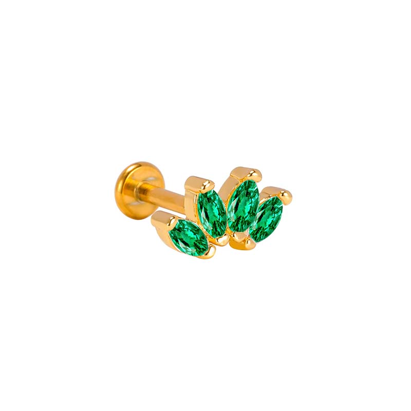 Labret/helix/tragus piercing in goud chirurgisch staal motief met 4 groene kristallen