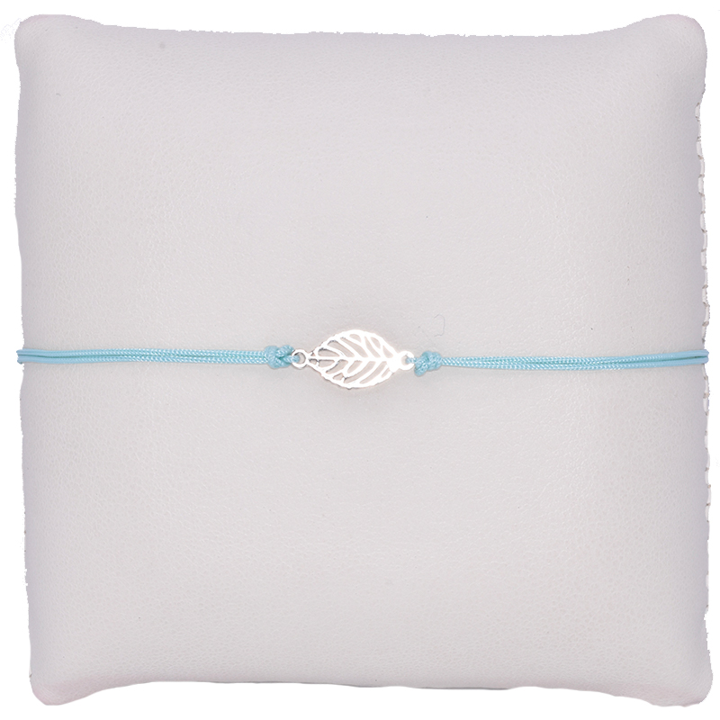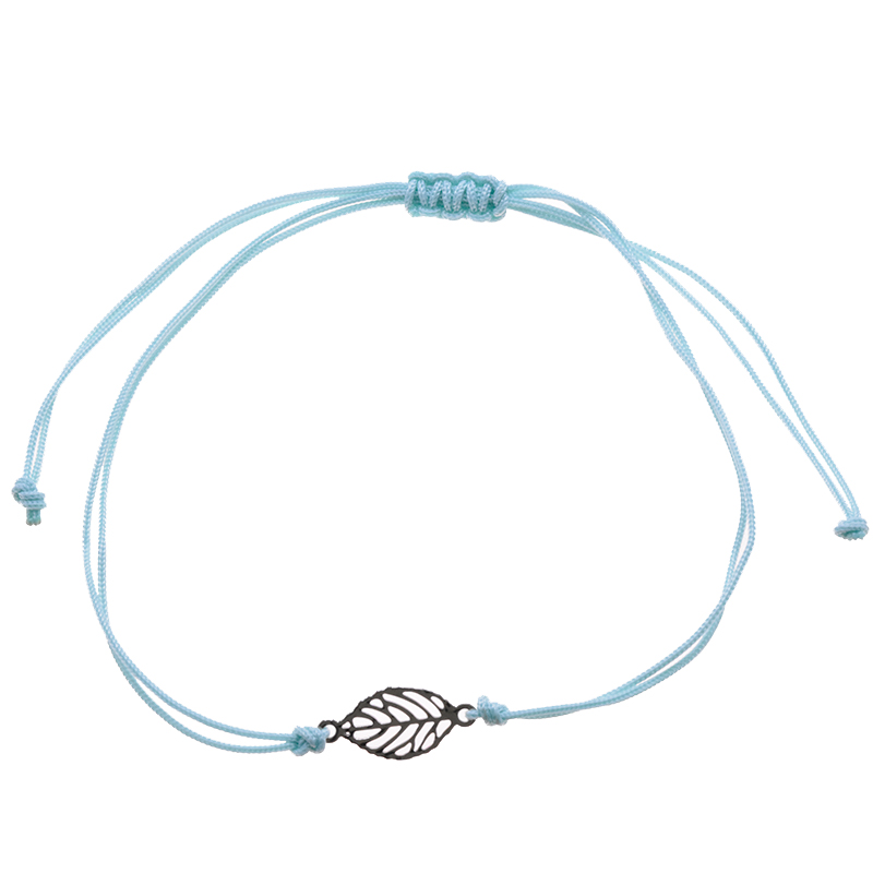 Licht Turquoise koordarmband met een blad in het midden! Dit armbandje is verstelbaar met een pull-tie sluiting en past om iedere pols. Pull-tie sluiting betekent simpel gezegd dat je het makkelijk zelf om en af kunt doen door aan de koordjes te trekken! De lengte van het motief bedraagt 12 mm, de breedte 7 mm.