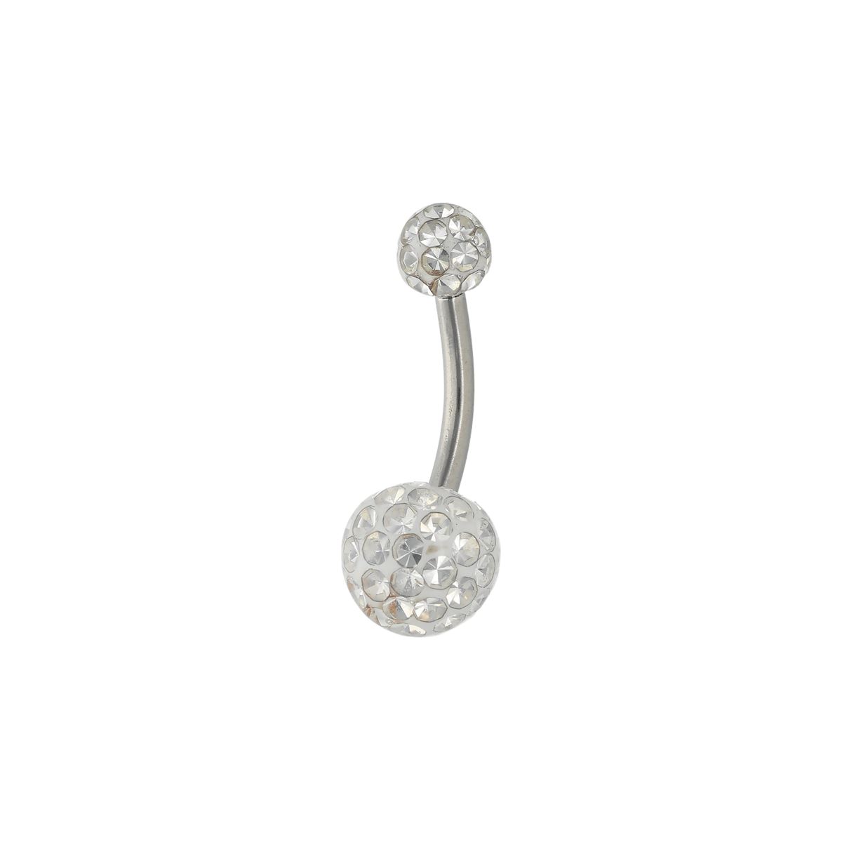 De gebogen staaf is vervaardigt van hoogwaardig chirurgisch staal 316L. De bovenste bal van 5 mm en de onderste bal van 8 mm zijn rondom bedekt met kristallen en beschermd met een transparante beschermlaag. Dit zorgt voor een optimale fixatie en glans van de kristallen. De gebruikte materiaal wordt gekenmerkt door zijn speciale eigenschappen zoals kleurechtheid en materiaalweerstand. Deze navelpiercing heeft een staafdikte van 1,6 mm en een staaflengte van 10 mm.