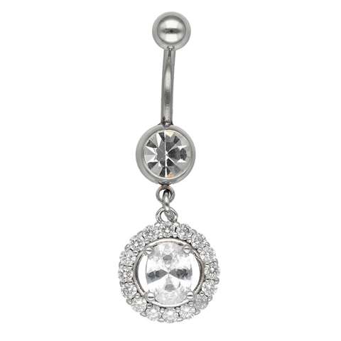 Navelpiercing in chirurgisch staal, ronde motief met witte kristallen