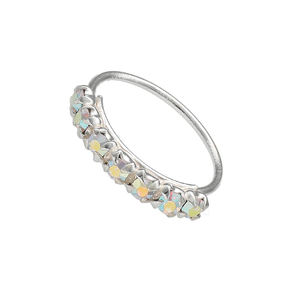 Deze ring is gemaakt van 925% zilver en bezet met 7 A.B. "prong" setting kristallen. De ring kan eenvoudig worden gebogen en zorgt zo voor eenvoudige bediening. Het gebruikte materiaal, zilver 925%, geeft het artikel een nobel uiterlijk en een mooie glans. De ring is eenvoudig te buigen en in het vertakkingskanaal in te brengen (zowel neus, oor en lip). De ring heeft een diameter van 8 mm en een staafdikte van 0.8 mm.