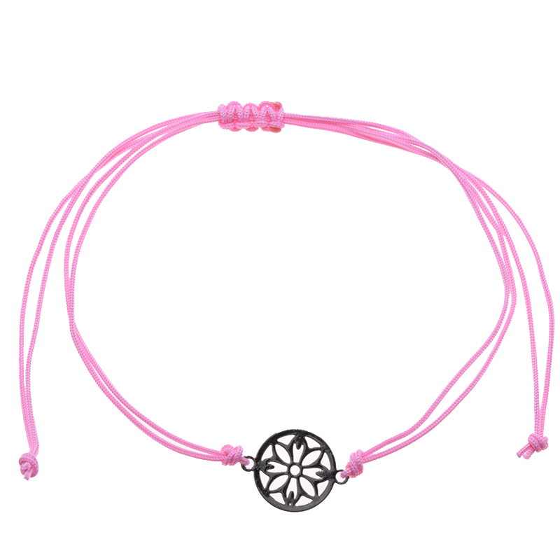 Roze koordarmband met een bloem motief in het midden! Dit armbandje is verstelbaar met een pull-tie sluiting en past om iedere pols. Pull-tie sluiting betekent simpel gezegd dat je het makkelijk zelf om en af kunt doen door aan de koordjes te trekken! De diameter van het motief bedraagt 10 mm.