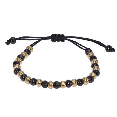 Zwart geknoopte touw armband. De gouden en zwarten armband met kralen is van edelstaal en heeft een mooie trendy tijdloze uitstaling. Deze armband is geschikt als dames- en als herenarmband. De diameter van de bolletjes bedragen 6 mm.