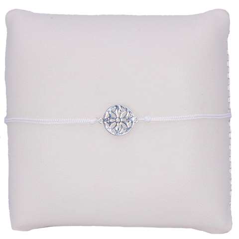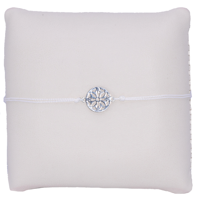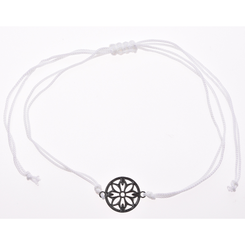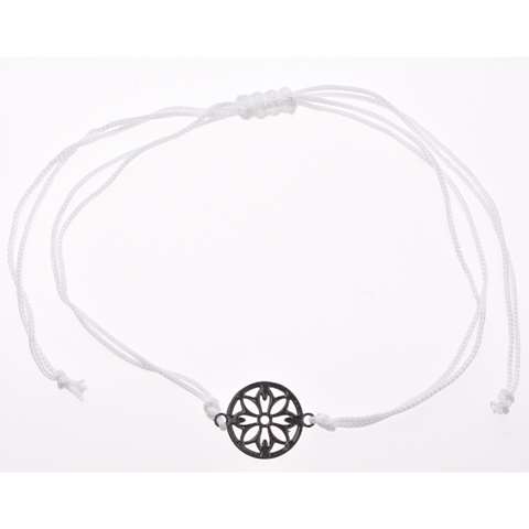 Witte koordarmband met een bloem motief in het midden! Dit armbandje is verstelbaar met een pull-tie sluiting en past om iedere pols. Pull-tie sluiting betekent simpel gezegd dat je het makkelijk zelf om en af kunt doen door aan de koordjes te trekken! De diameter van het motief bedraagt 10 mm.