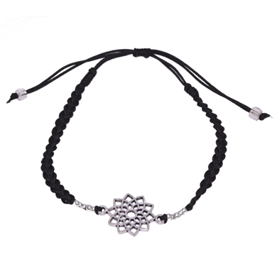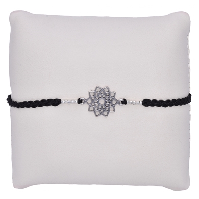 Zwartkleurige armband met een bloem motief in het midden! Dit armbandje is verstelbaar met een pull-tie sluiting en past om iedere pols. Pull-tie sluiting betekent simpel gezegd dat je het makkelijk zelf om en af kunt doen door aan de koordjes te trekken! De diameter van de motief bedraagt 14 mm.