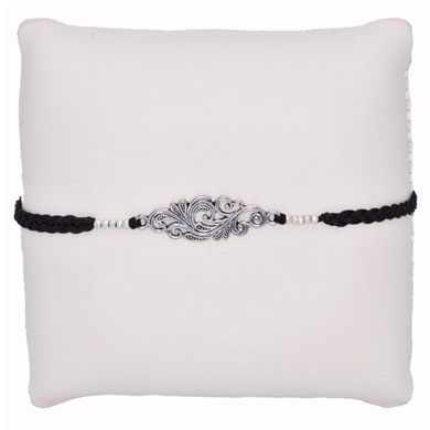 Zwartkleurige armband met een stalen motief in het midden! Dit armbandje is verstelbaar met een pull-tie sluiting en past om iedere pols. Pull-tie sluiting betekent simpel gezegd dat je het makkelijk zelf om en af kunt doen door aan de koordjes te trekken! De lengte van de motief bedraagt 27 mm.