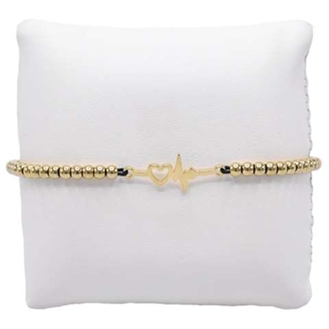 Zwarte koordarmband met stalen gouden bolletjes en een hart/hartslag motief. Dit armbandje is verstelbaar met een pull-tie sluiting en past om iedere pols. Pull-tie sluiting betekent simpel gezegd dat je het makkelijk zelf om en af kunt doen door aan de koordjes te trekken! De lengte van het motief bedraagt 24 mm.